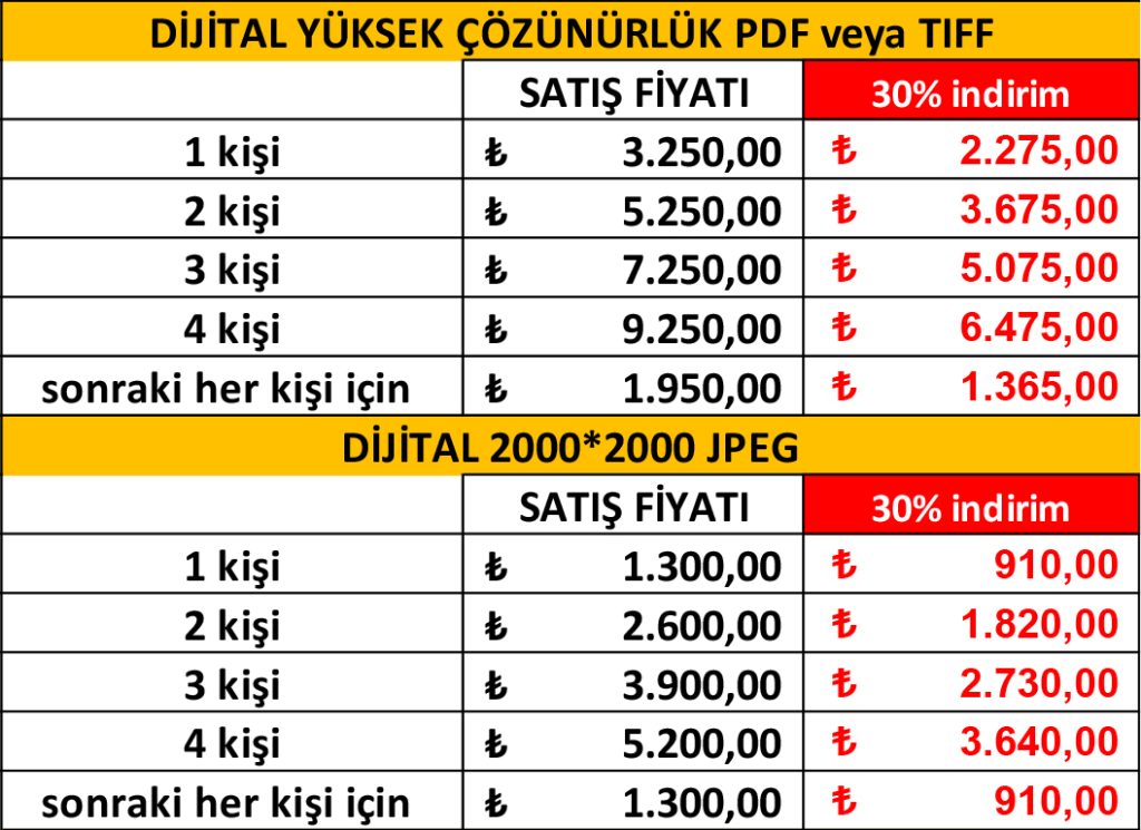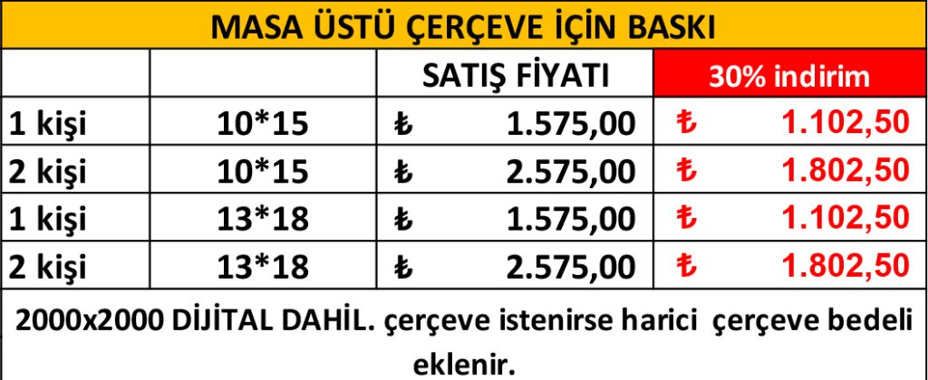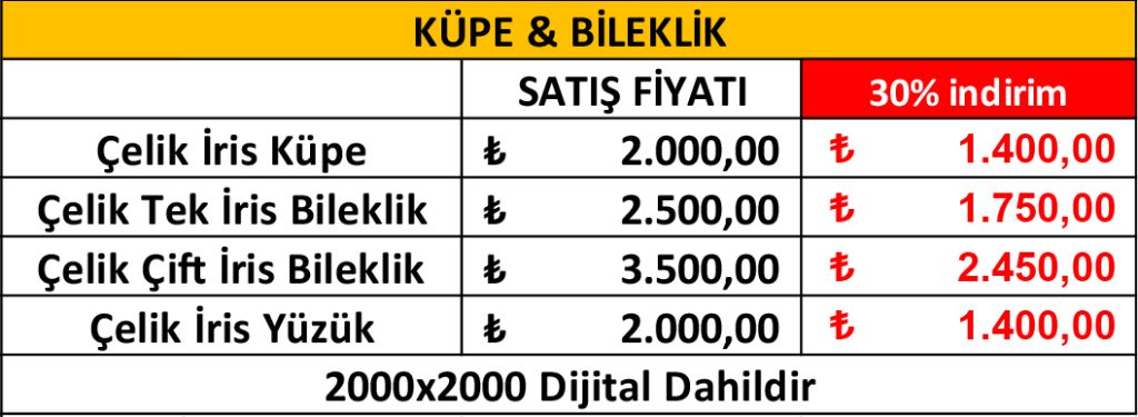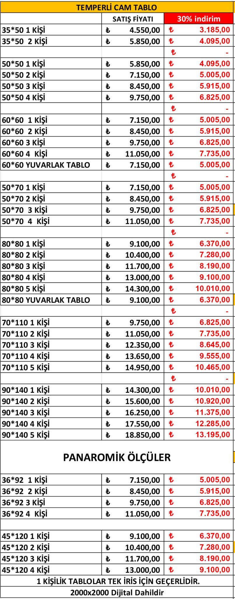 Fiyatlarımıza KDV dahildir. aşağıda yer alan ölçüler dışında farklı bir ölçü için fiyat teklifi alınız. İristograf tüm kampanya ve fiyat değişikliği hakkını saklı tutar.
